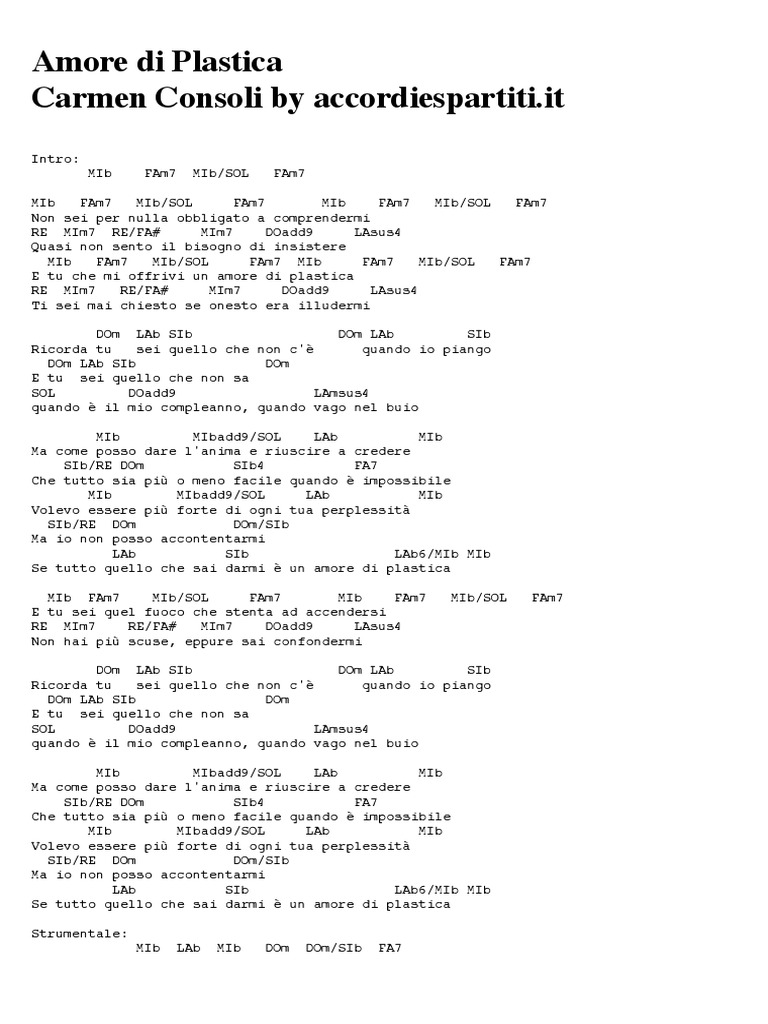 Sol la sol6/re re se tutto quello che sai darmi è un amore di plastica. Non sei per nulla obbligato a comprendermi quasi non sento il bisogno d'insistere tu che mi offrivi un amore di plastica ti sei mai chiesto se onesto era illudermi ricorda tu sei quello che non c'è quando io piango tu sei quello che non sa quando è il mio. La canzone, scritta dalla consoli e da mario venuti, ottenne un modesto ottavo posto. Ogni stampo è fatto a mano da me. Accordare⇒ vtrverbo transitivo o transitivo pronominale: